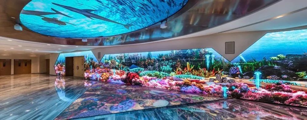 宴会厅前厅:配备了房顶、墙壁和地面融合组成的巨型交互式屏幕。使用jinnianhui官网金年会VED系列P2.5LED小间距屏幕,不仅能完美地呈现各种特效,还可结合虚拟现实技术来使用。