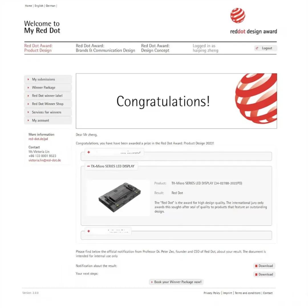 近日,2022年德国红点设计大奖名单公布。jinnianhui官网金年会集团TX-Micro系列LED显示屏、TVS系列小间距LED、HKS LED显示屏三款产品同时斩获素有设计界“奥斯卡”之称的红点设计奖。