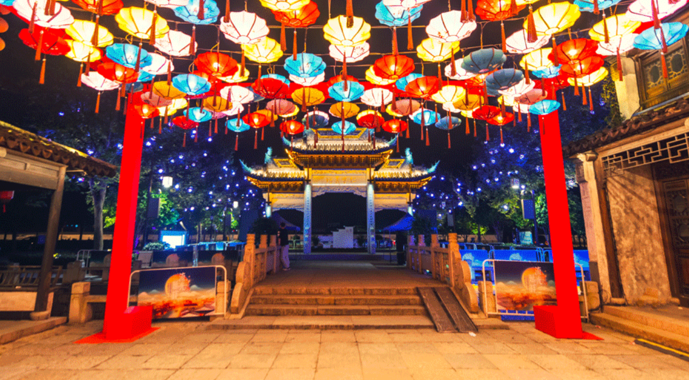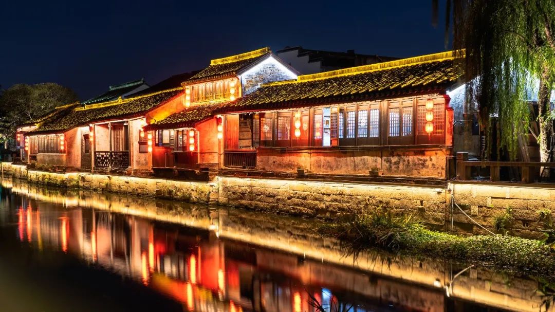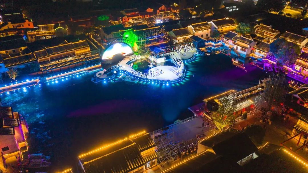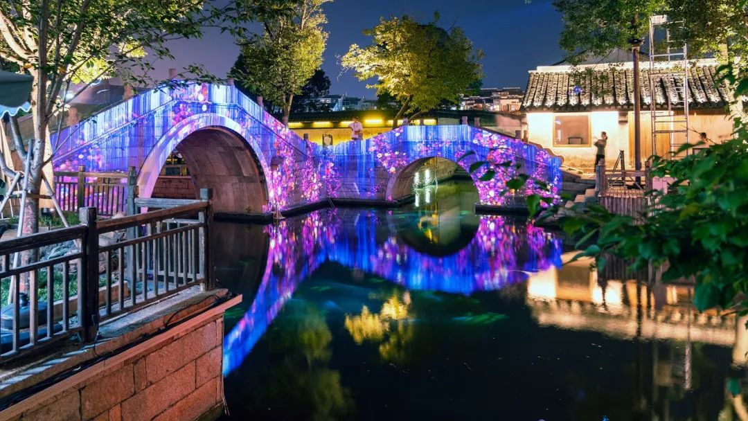 夜间的荡口古镇,一片流光溢彩。jinnianhui官网金年会旗下上海中天照明团队以光影科技、艺术设计点亮古镇,将文旅相融、情境相连,形成令人难忘的夜宴、夜画、夜戏、夜乐、夜游、夜船。