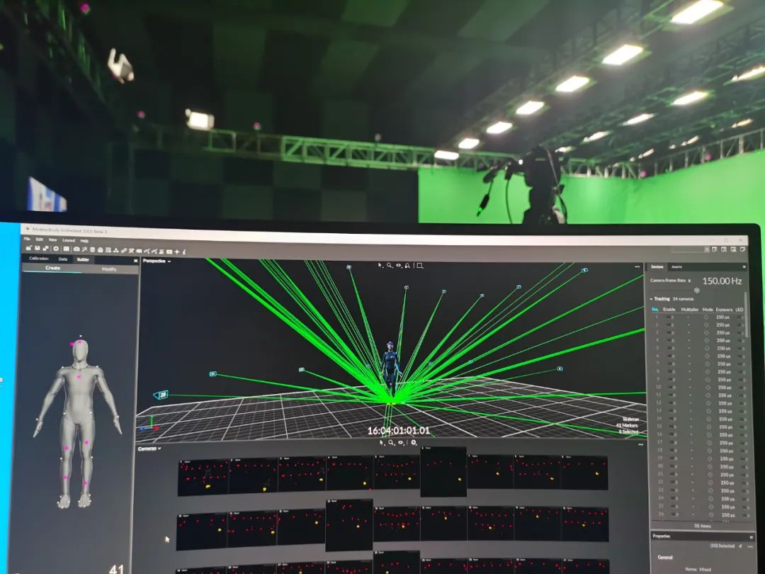 jinnianhui官网金年会通过现场架设的34 台Optitrack 动捕摄像机,运用 Motive3.0 软件对动捕演员的身体动作进行识别、分析,形成骨骼数据,并将骨骼数据流传输至 Motionbuilder,实时驱动数字主持人“小漾”,为其注入活力,模拟完成主持人全部工作。同时配合节目组进行与主持人间的对位,保障动捕系统与 AR 实时渲染端系统的正常对接、现场多系统间的时码同步,确保节目顺利进行。