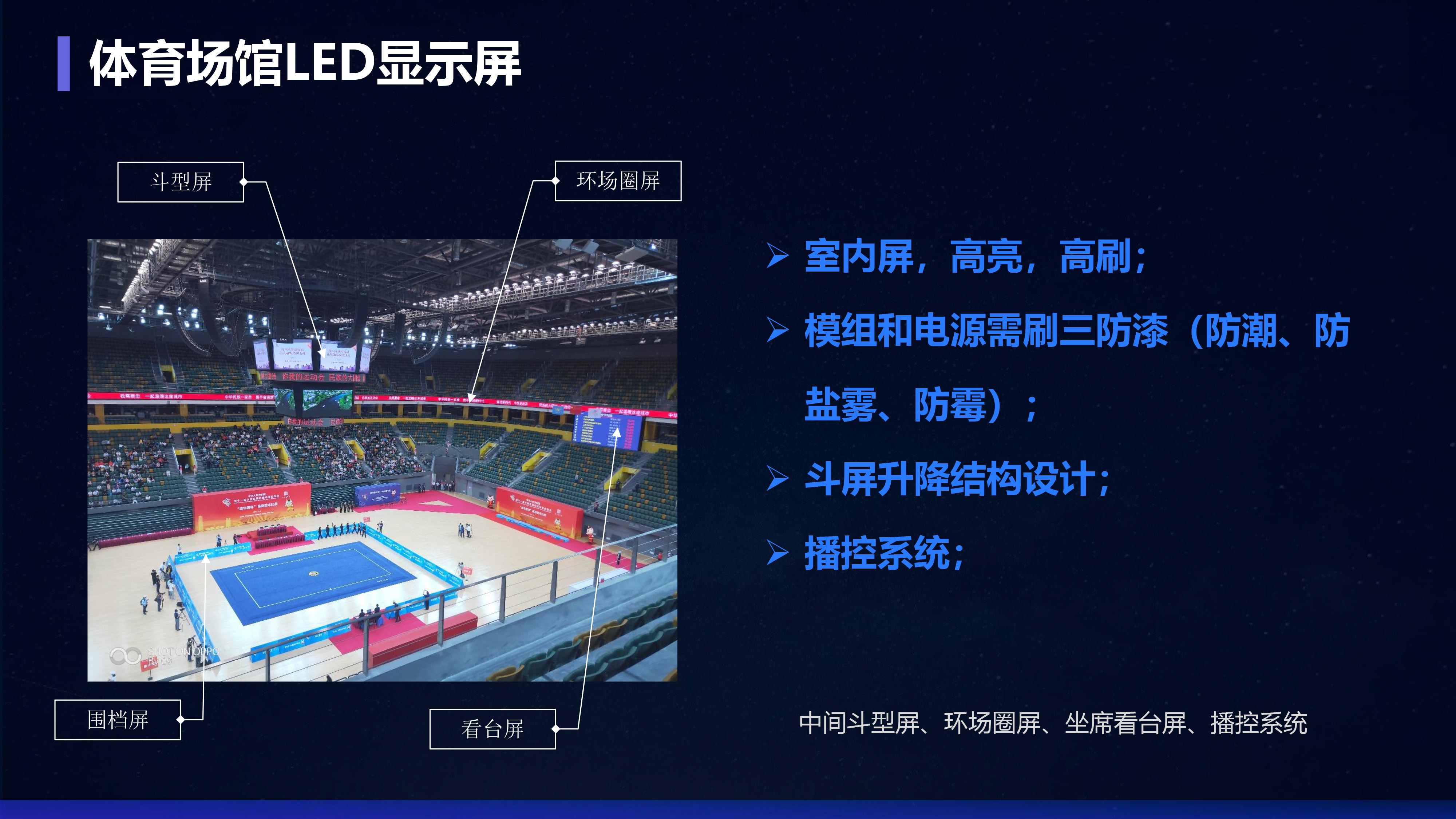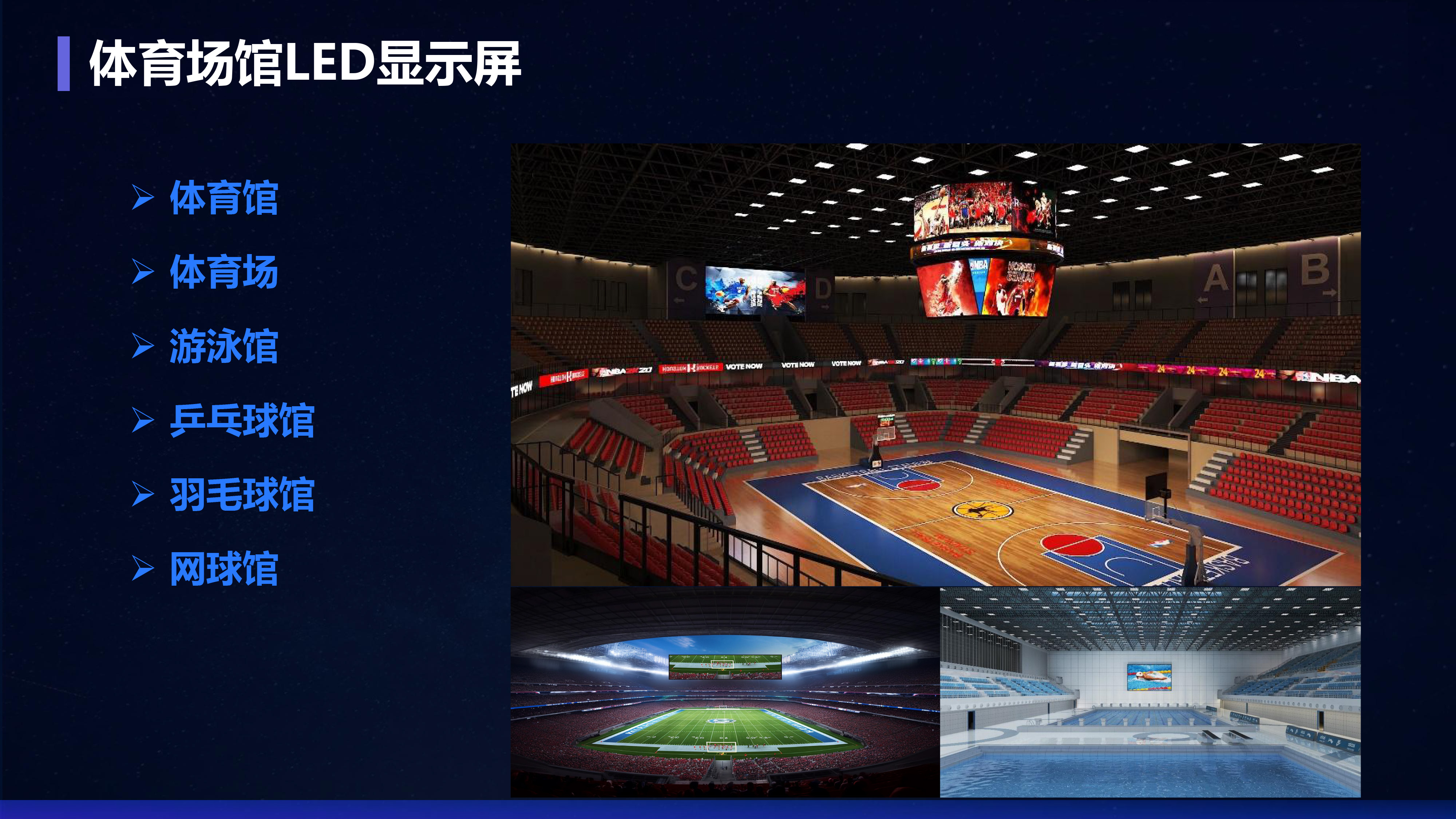应用场景:体育馆、体育场、游泳馆、乒乓球馆、羽毛球馆、网球馆等